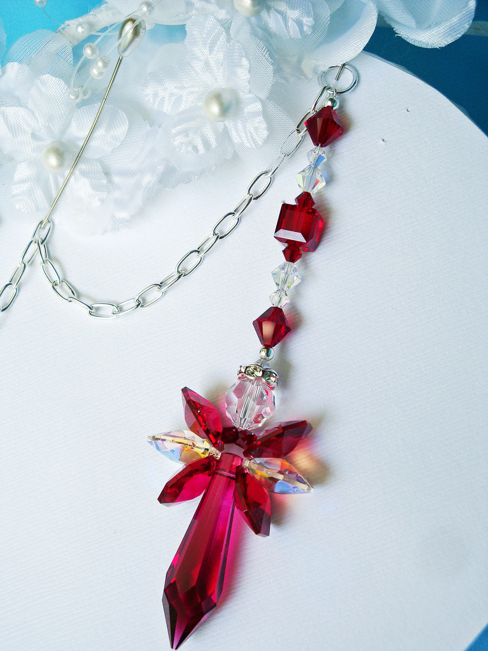 Swarovski Red Bordeaux and Clear Crystal wings with a 40mm Swarovski Red Bordeaux Pencil Drop Pendant