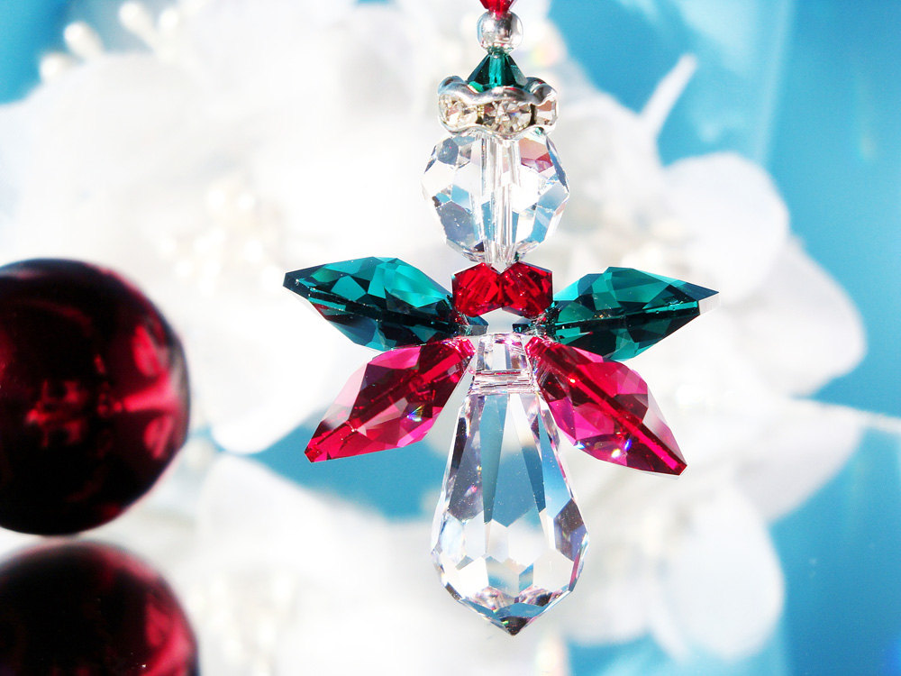 Angel Christmas Ornament created with Swarovski Green and Red Crystals.
