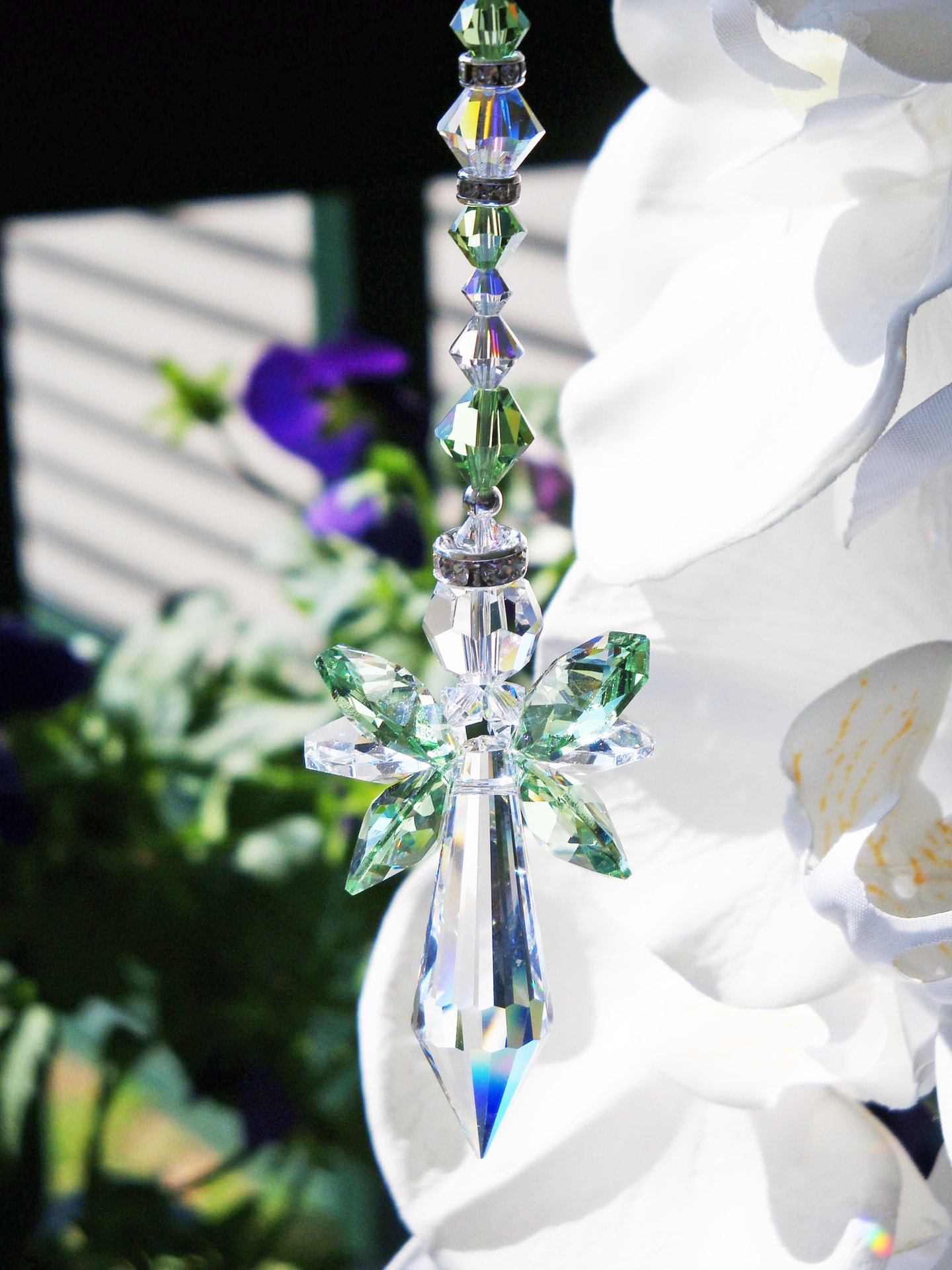 Guardian Angel Car Charm created with Swarovski Peridot Green and Clear Crystals. Hang this beautiful angel from the rear view mirror in your car as a symbol of love and protection to you while you're driving:-)